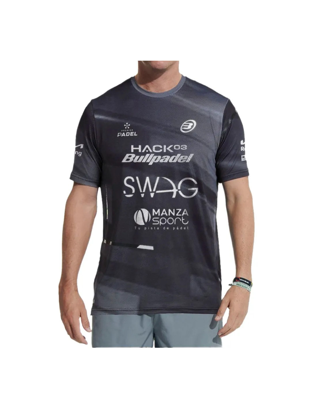Paquito Navarro , professional player, wears the official Bullpadel Adula t-shirt. Created for Premier Padel, this garment stands out for its style and functionality. Made from an elastic fabric that dries quickly, its short-sleeved and round-neck design ensures comfort and mobility during your matches.