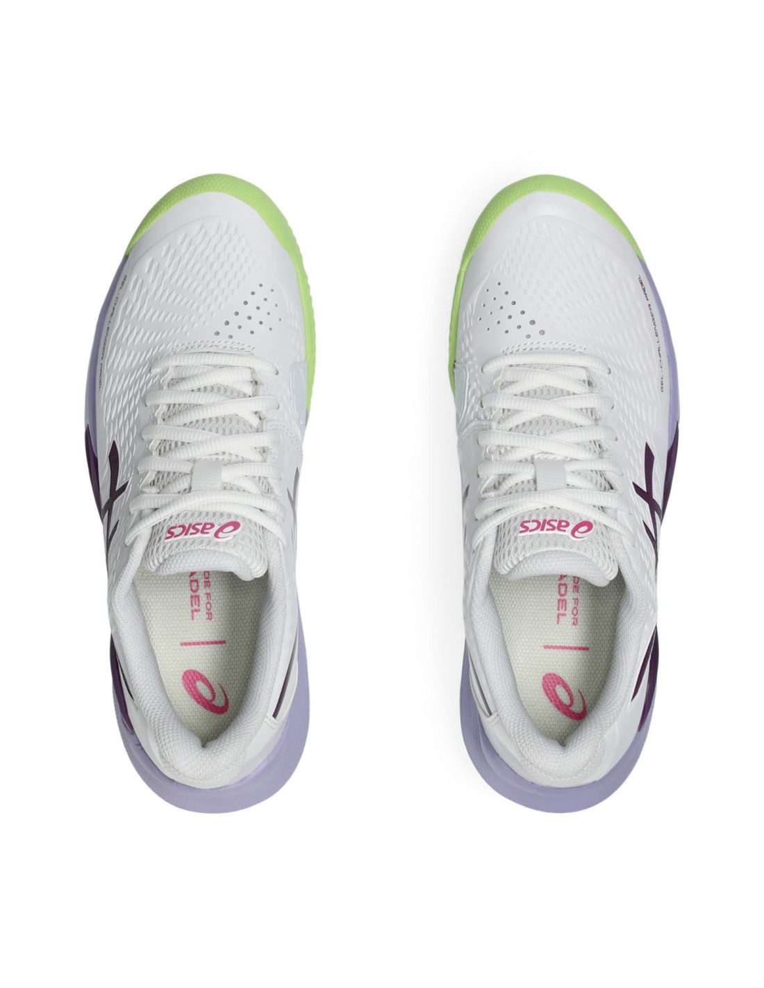 Designed for women, these Asics Gel Challenger 14 shoes are specific for padel practice. They provide stability, comfort and support to the foot in every movement and change of direction. Sporty design in white, with lilac and green details. The instep of the shoe keeps your foot fixed at all times. Its sole , specific for padel , is more durable and flexible, improving the natural movement of the footprint.