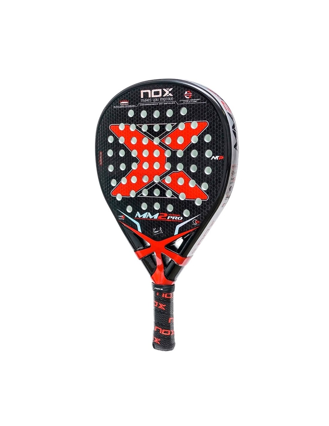 Il Nox MM2 Pro è realizzato in carbonio, che gli conferisce resistenza, rigidità e durata. I piani racchetta sono realizzati con fibra di carbonio 12K, che ne garantisce la resistenza e la durata senza comprometterne le prestazioni. Il nucleo della racchetta è realizzato in gomma EVA HR3, una gomma ad alta densità che fornisce un tocco solido e of un'eccellente uscita della palla ad ogni colpo.